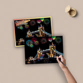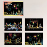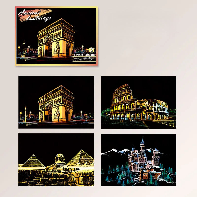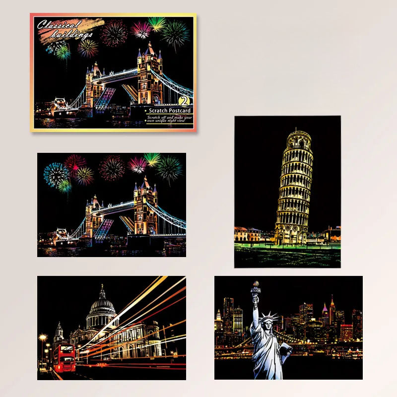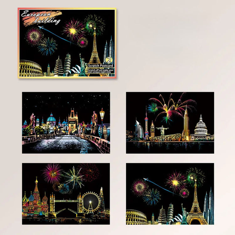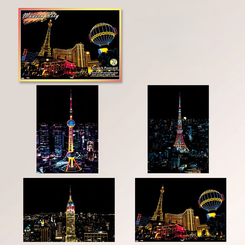 Unleash creativity and explore the beauty of world cities with this 4-piece DIY Night Scene Scratch Painting Set. Each scratchboard postcard (20×14cm/7.9×5.5in) reveals a vibrant city landscape hidden beneath a matte black surface—just use the included wooden pen to scratch away the top layer and watch stunning colors come to life. Made from premium coated art paper, these durable cards resist wear and produce brilliant artwork that lasts. Featuring four unique city designs, they’re not only fun but also educational, sparking interest in geography, history, and culture. Perfect as a birthday gift, travel keepsake, or room decor, these scratch paintings let kids and adults alike create dazzling artwork while making lasting memories.