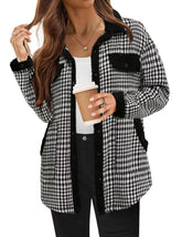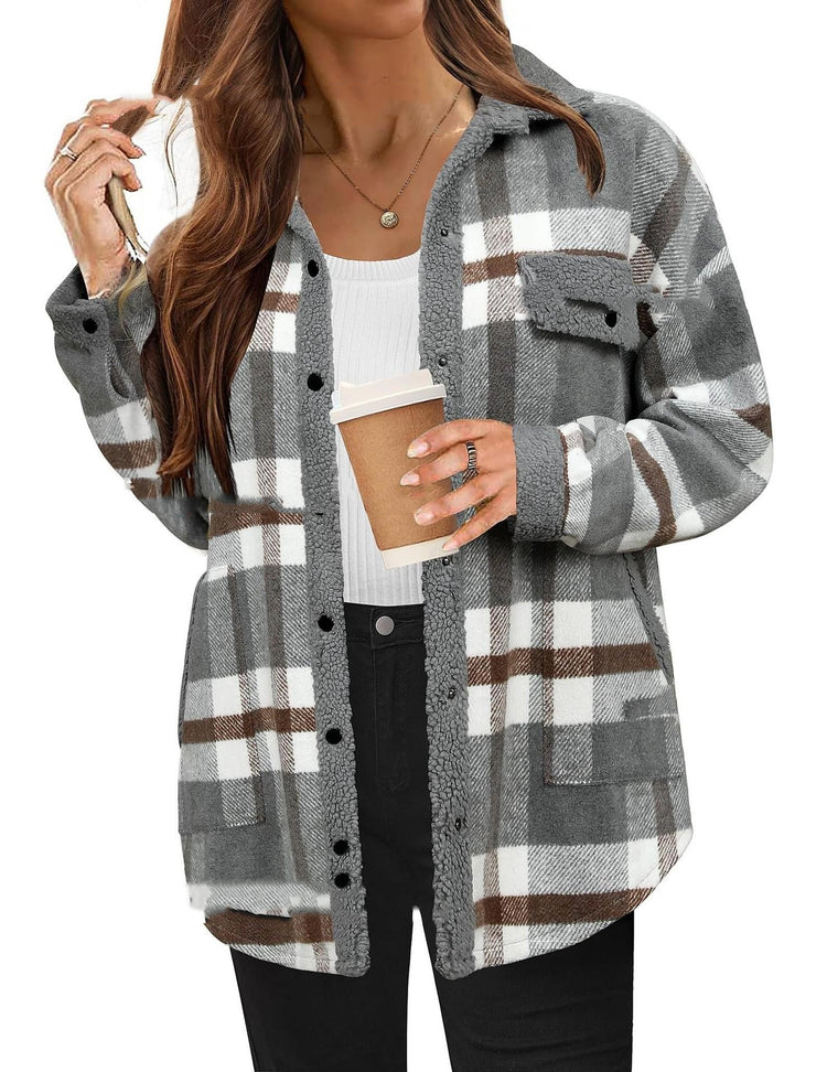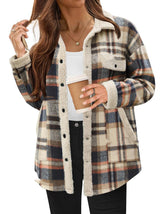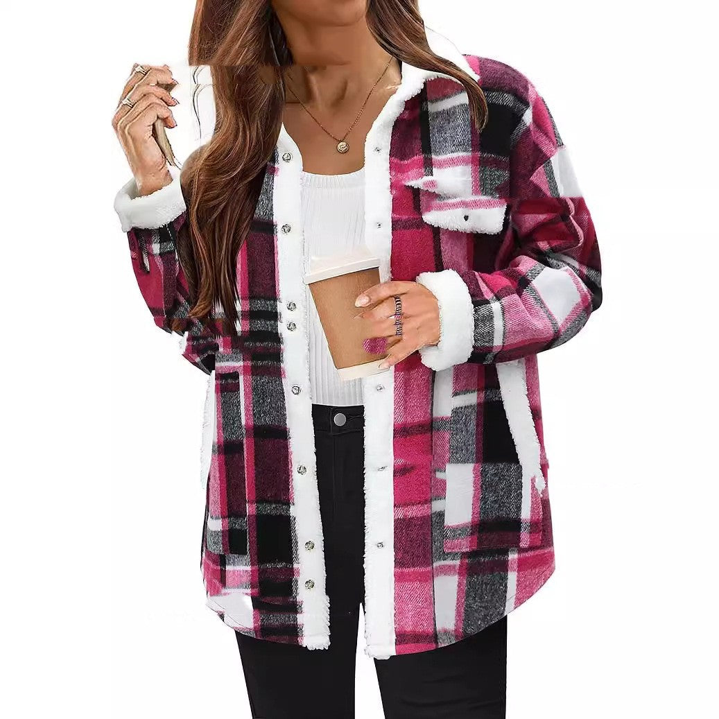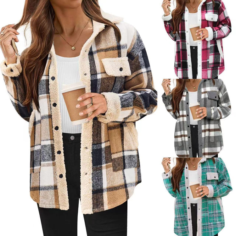 Contrast Color Plaid Jacket Casual Polo Collar Velvet Coat